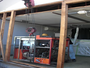 | 当社の大ベテランの合図をもとに、他のスタッフがゆっくりと機械を引っ張り出します。 |