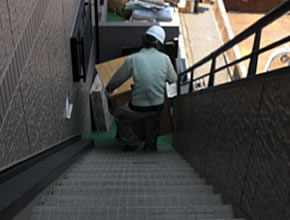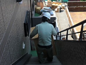 | 机などは2名で安全を確認しながら搬出していきます。(分かりにくいですが下でも支えてます。(^^;)) |