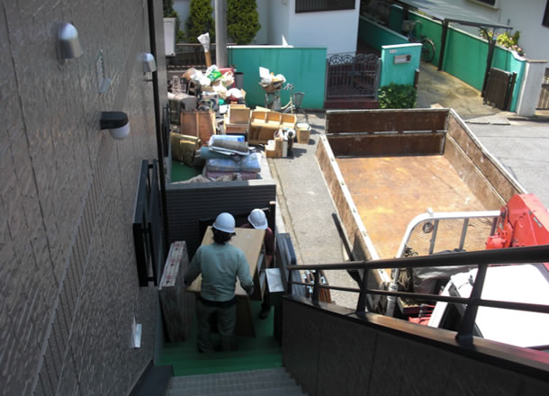| 「引越しをする前に家の中にある家財道具をすべて処分してほしい」というご依頼を頂きました。当社リピーターのお客様からのご紹介で、こちらはその親戚にあたる方でした。お電話で大体の品物の数量、周りの道路の状況など数点を確認させて頂き、直接回収にお伺いすることになりました。二世帯住宅とのことで部屋数も7部屋以上あり、建物はかなり広く立派なご自宅です。玄関部分は建物の2階にあり、さらに3階へ上がる階段もあります。トラックへの積込み順番、品物の数量などもあるので回収物を一通り確認させてもらいました。昨日まで使っていたような机からベッド・布団・雑誌・自転車・家電など色々な物があります。3階の子供部屋にあったベッドなどは組み立て式なので、当然バラさないと階段から運び出すことは出来ません。そこで解体する作業員と搬出する作業員に分かれて作業を行いました。 |