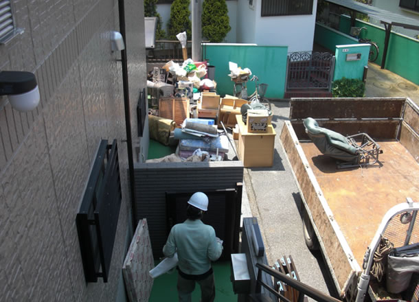 | 家の中にある家財道具は全て出しました。あとは分別しながらトラックに載せていきます! |