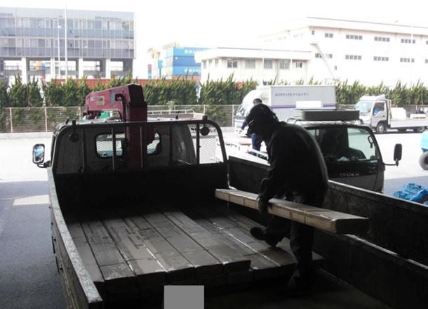 | 搬入・搬出口にトラックをつけました。パレットに載せた在庫品が次々と運ばれてきます。 |